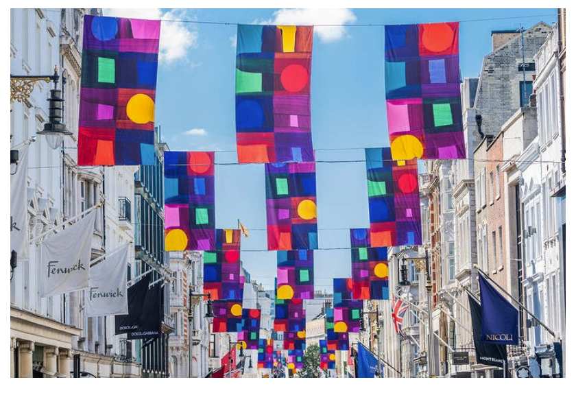 Contemporary British artist Mali Morris RA has been commissioned to design the flags that hang above Bond Street. Her multi-layered, abstract work, with a key focus on colour, light and space, makes the flags a vibrant and contemplative focal point of this annual celebration of creativity.