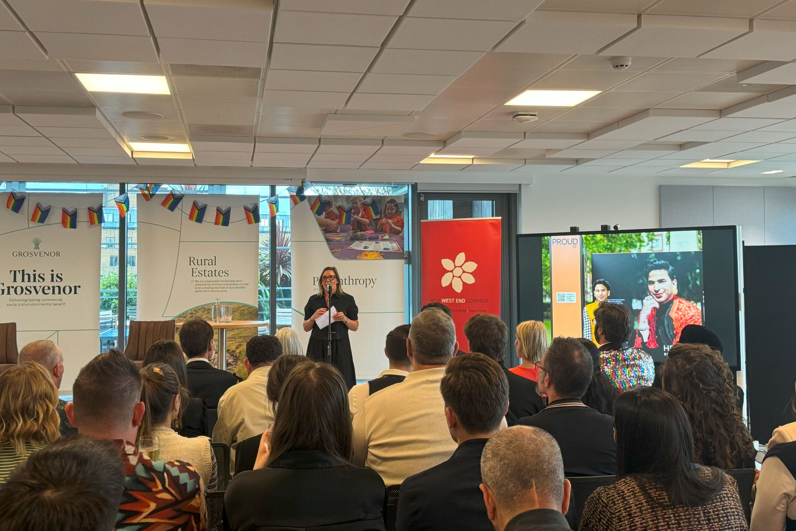 On 11 June, to officially launch our immersive art exhibition, PROUD West End, we hosted a remarkable evening of live storytelling, during which members of our LGBTQIA+ community shared their experiences of self-discovery, resilience and pride. A celebration of voice and representation, delivered in collaboration with Grosvenor and Heard Storytelling, PROUD West End is a free-to-visit open air audio-visual exhibition. PROUD West End’s “living portraits” of the district’s LGBTQIA+ community is running until early July in Grosvenor Square.