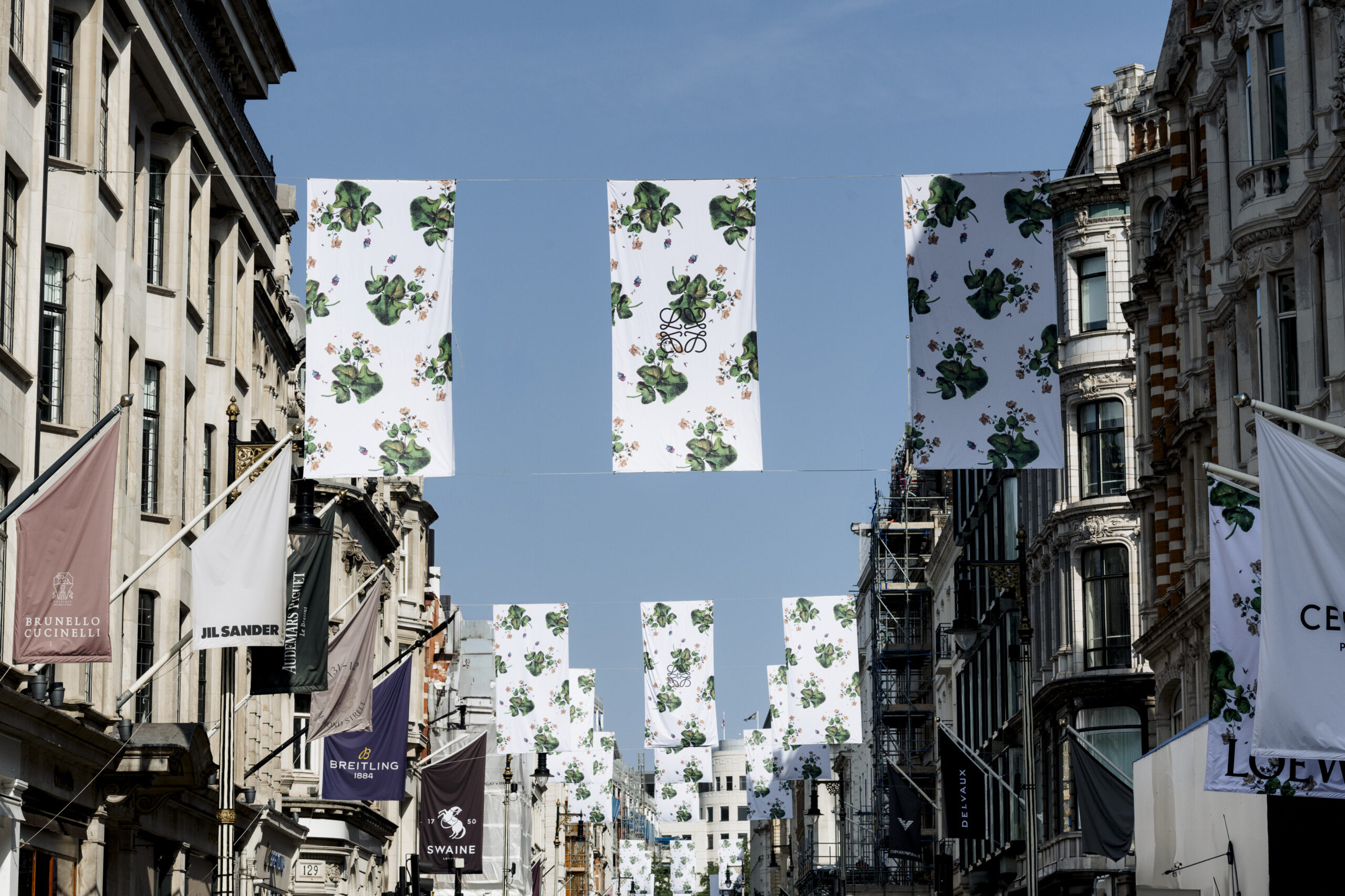 To celebrate the arrival of LOEWE’s Fall Winter 2024 collection, the brand staged a flag takeover of Bond Street for the month of September. Spanning the length of Bond Street from Piccadilly to Oxford Street, the flags featured a key print from the FW24 collection, with botanical and floral motifs taking centre stage, abstracted from antique ceramics and wallpapers.