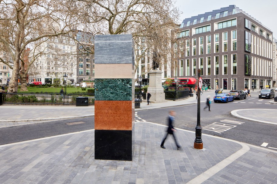 The sculpture brings together layers of coloured marble into a single compressed tower that reflects the deep layers and sediments of history and lived experiences of the diverse people that Hanover Square and London’s West End represents. The selected marbles translate the layered landscape of Hanover Square itself, the new gardens and surrounding buildings – the grey, sand and ochre of the footways and buildings, and the greens and blue-greens of the trees. Together they create a chord that reflects the musical history of the area – the Hanover Music Rooms and Handel’s connections with Brook Street and St George’s Church.